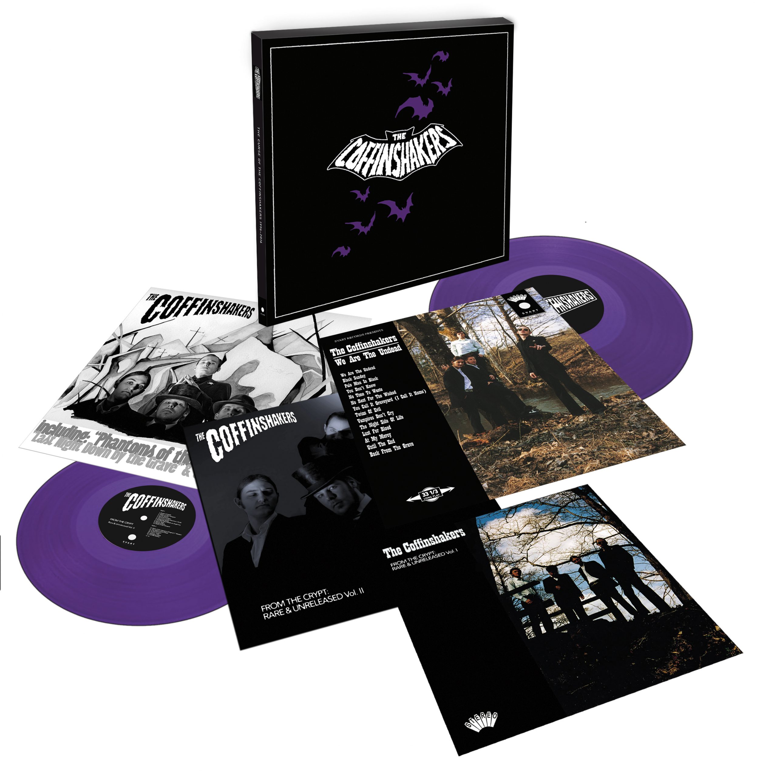 Svart Records are proud to announce the official Coffinshakers vinyl reissues, which have been in the works for a couple of years now. These reissues include the full length albums We Are The Undead (1998) and The Coffinshakers (2007), both of which come in repro-sleeves with original artwork. There’s also a deluxe box set edition titled “The Curse of the Coffinshakers 1996-2016”, which includes both albums, 2 bonus LPs (From the Crypt – Rare and Unreleased vol. I and vol. II) and a thick booklet with a lengthy interview and archive material. The bonus LPs are only available in the box set and they include rare compilation tracks, EP releases and a handful of unreleased tunes from Rob Coffinshaker’s personal vaults.